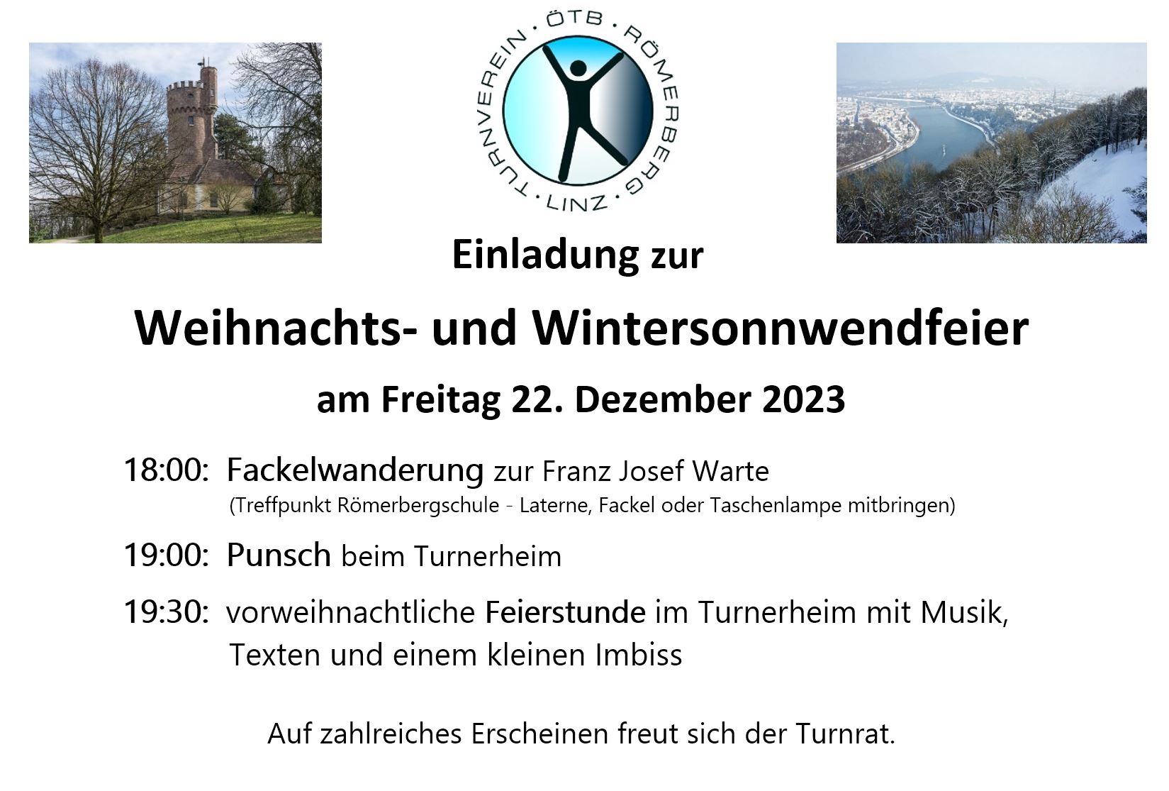 | Weihnachtsfeier | Freitag 22.12.2023 | 18:00 Fakelwanderung zur Franz-Josef-Warte 19:00 Punsch vorm Turnerheim 19:30 Weihnachtsfeier ![]() |